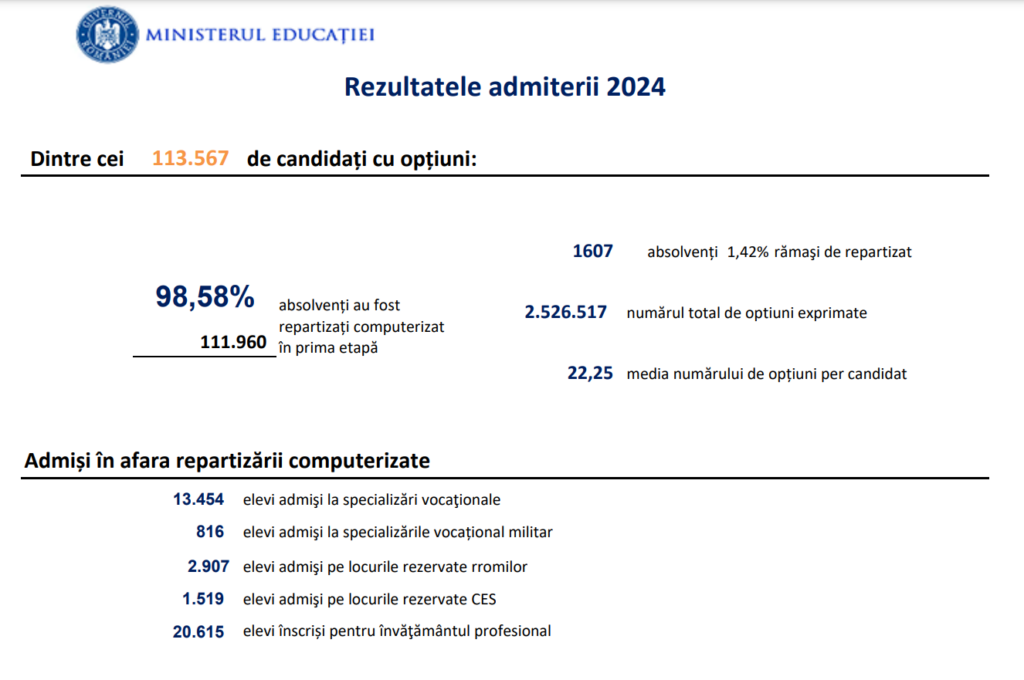 Potrivit Ministerului, trendul ascendent al numărului de elevi repartizați computerizat în învățământul liceal de stat se păstrează și în acest an. Astfel, la nivel național, din totalul elevilor – 113.567 – cu opţiuni completate, au fost repartizaţi computerizat 111.960 de elevi (98,58%), comparativ cu etapele similare din ultimii trei ani: 111.128 de elevi – 2023, 110.035 de elevi – 2022, respectiv 89.983 de elevi – 2021.