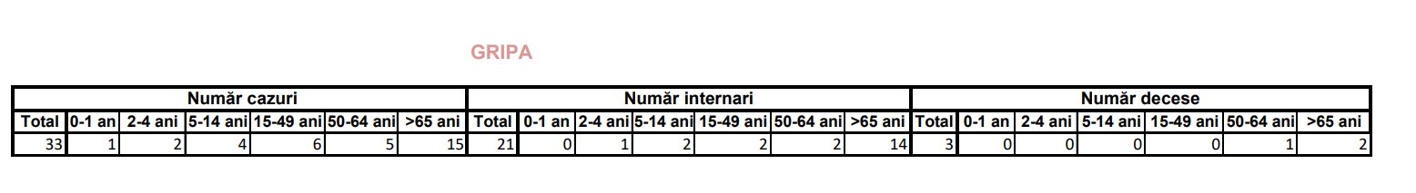 De asemenea, au fost înregistrate și trei decese ale unor pacienți diagnosticați cu gripă, fiind vorba despre o persoană cu vârsta cuprinsă între 50 și 64 de ani și alte două persoane cu vârste mai mari de 65 de ani.