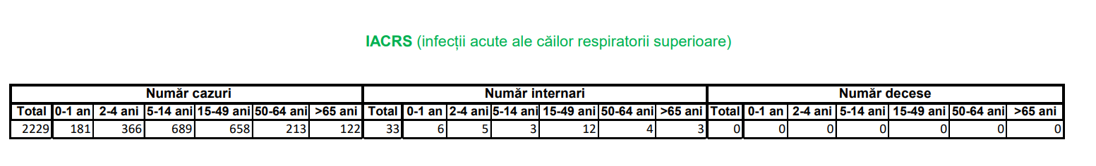 În ceea ce priveşte infecţiile acute ale căilor respiratorii superioare, au fost înregistrate în perioada amintită 2.229 de cazuri, din care 33 internate. Cele mai multe cazuri de IACRS au fost înregistrate la grupa de vârstă 5 – 14 ani (689), urmată de grupa 15 – 49 ani (658) și 2 – 4 ani (366).