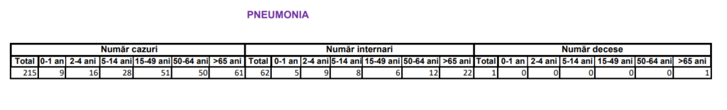 În perioada 13 – 19 februarie, medicii au raportat și 215 cazuri de pneumonie, cu 62 de internări. Cea mai afectată grupă de vârstă a fost a persoanelor de peste 65 de ani (61 de cazuri), urmată de grupa 15 – 49 de ani (51 de cazuri) și de grupa 50 – 64 de ani (50 de cazuri). Totodată, o persoană cu vârsta peste 65 de ani, care a fost diagnosticată cu pneumonie, a decedat.