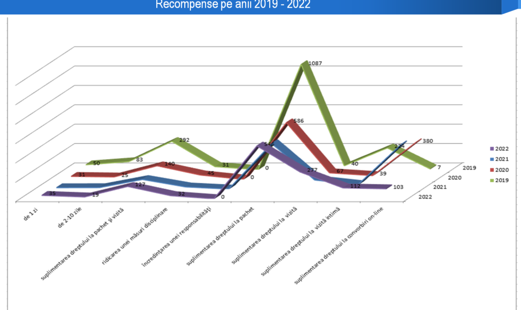 Totodată, anul trecut au fost acordate și circa 1.250 de recompense, cele mai multe vizând suplimentarea dreptului la pachet sau suplimentarea dreptului la vizită.