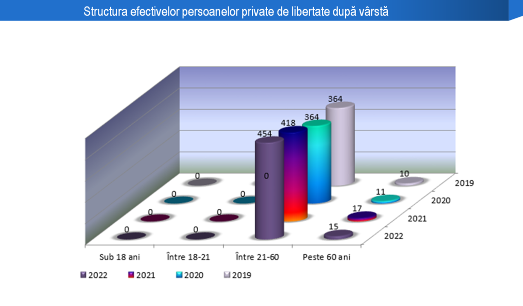 În ceea ce privește vârsta, cele mai multe persoane private de libertate au între 21 și 60 de ani (454), dar sunt și persoane cu vârste peste 60 de ani (15).
