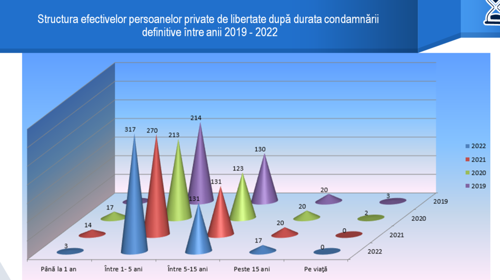 Același document mai arată că pedeapsa predominantă este cuprinsă între 1-5 ani, iar infracţiunea predominantă este cea de furt calificat.