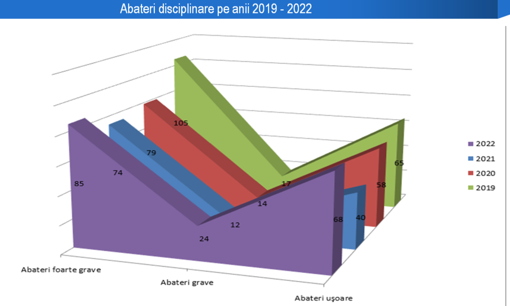Pe parcursul anului 2022, comisia de disciplină din cadrul Penitenciarului Bistrița a analizat și un număr de 231 de rapoarte de incident şi a aplicat 177 de sancţiuni disciplinare. În funcţie de gravitate, abaterile comise de persoanele private de libertate au fost împărțite în trei categorii – foarte grave – 85, grave – 24 şi ușoare – 68.