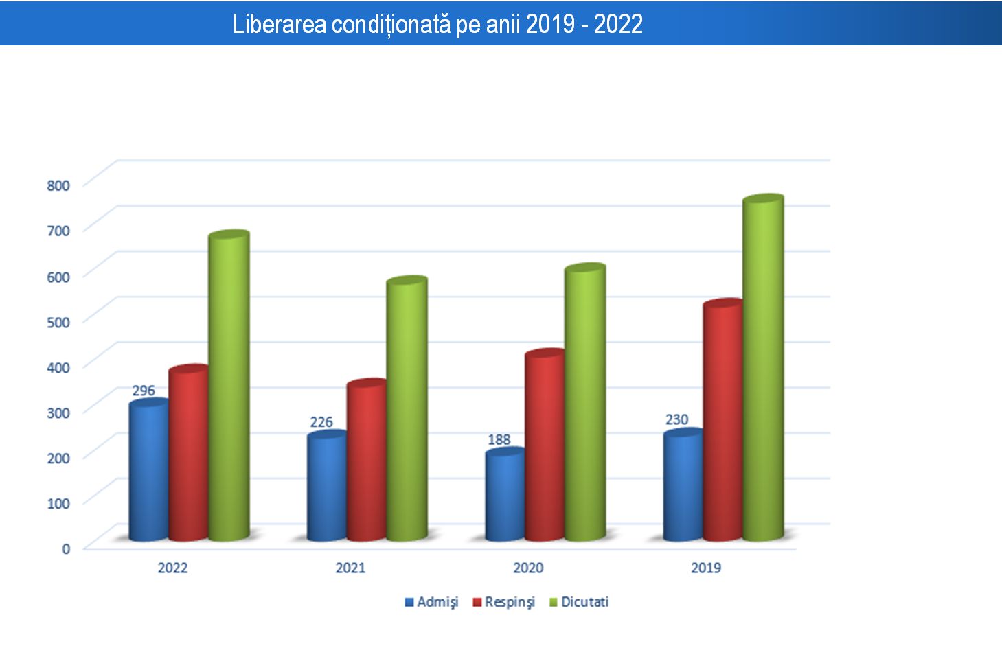 Pe parcursul anului trecut, comisia de propuneri pentru liberare condiţionată şi-a desfăşurat activitatea în 52 de şedinţe. ”Au fost discutate 666 persoane, din care 296 admise și 370 respinse. 180 din cele respinse au făcut cerere de liberare condiționată, instanţa de judecată reducând termenul în 7 cazuri și dispunând liberarea condiţionată în 22 cazuri. Pentru 82 de persoane private de libertate s-a respins propunerea de liberare condiţionată formulată de comisie”, se mai arată în raport.