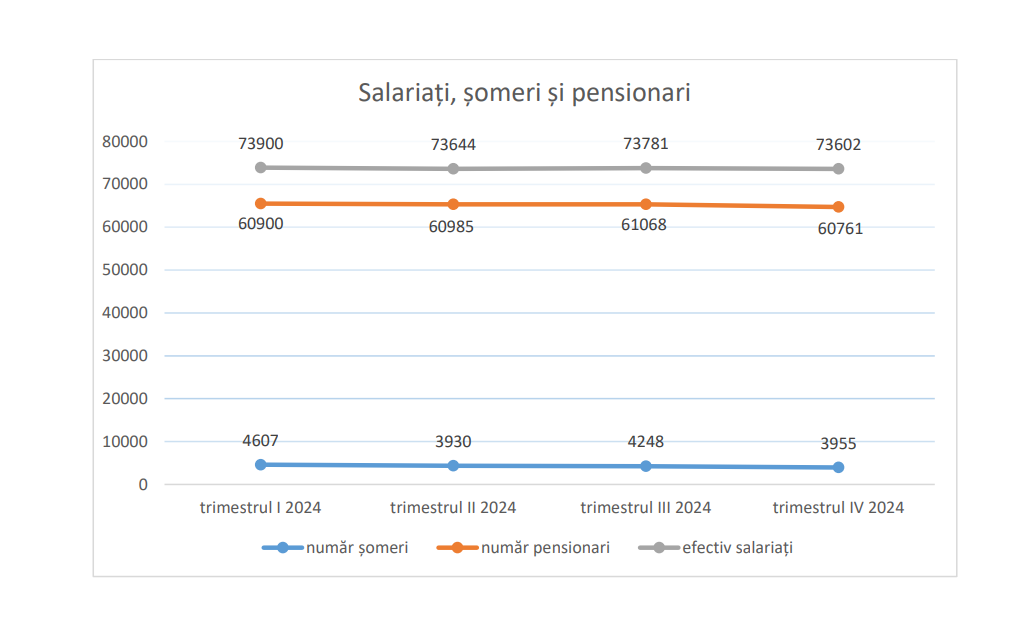 Totodată, în trimestrul al patrulea al anului 2024, numărul mediu al pensionarilor de asigurări sociale de stat din judeţ a fost de 60.761 persoane, în scădere cu 80 persoane comparativ cu trimestrul corespunzător al anului 2023. Faţă de trimestrul anterior, numărul pensionarilor a scăzut cu 307 persoane.