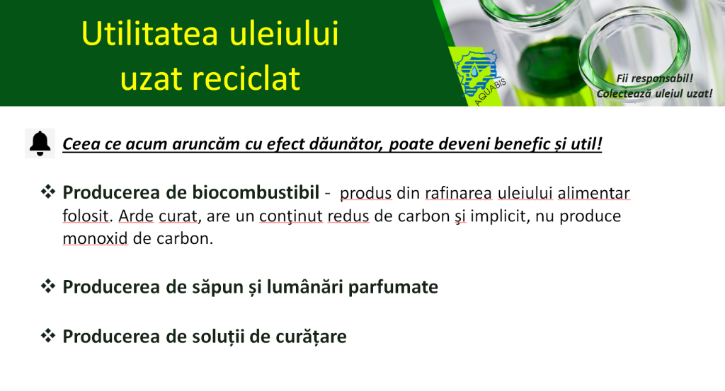 Potrivit specialiștilor, un singur litru de ulei aruncat în chiuvetă poate polua sute de litri de apă și afectează rețelele de canalizare. În schimb, uleiul colectat poate fi valorificat prin reciclare, fiind folosit pentru producerea de biocombustibili, săpun, lumânări sau soluții de curățare.