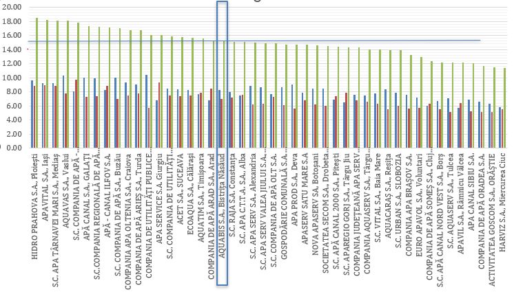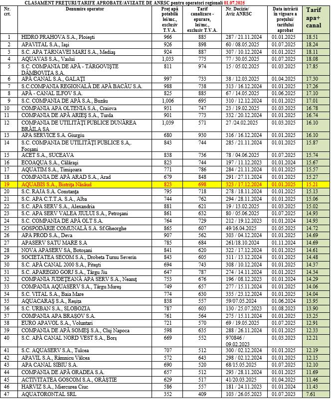 ”Aquabis S.A. se află pe poziția 19 din 47 de operatori, cu un tarif cumulat apă + canal de 15,21 lei/mc (fără TVA), ceea ce o plasează în jumătatea mediană a clasamentului național. Prețul total este alcătuit din: 8,23lei/mc pentru apă potabilă (captare, tratare și distribuție), echivalent cu 0,00823 lei/litru și 6,98lei/mc pentru canalizare și epurarea apelor uzate. Comparativ, 18 operatori regionali din România practică tarife mai ridicate, în timp ce 28 au tarife mai reduse, însă în majoritatea cazurilor aceștia operează în condiții mai favorabile, atât din perspectiva resurselor, cât și a infrastructurii existente. Clasamentul confirmă faptul că tarifele Aquabis sunt aliniate cu media națională și reflectă investițiile în derulare și complexitatea serviciului oferit”, precizează Aquabis S.A. într-o postare pe pagina oficială de pe Facebook.