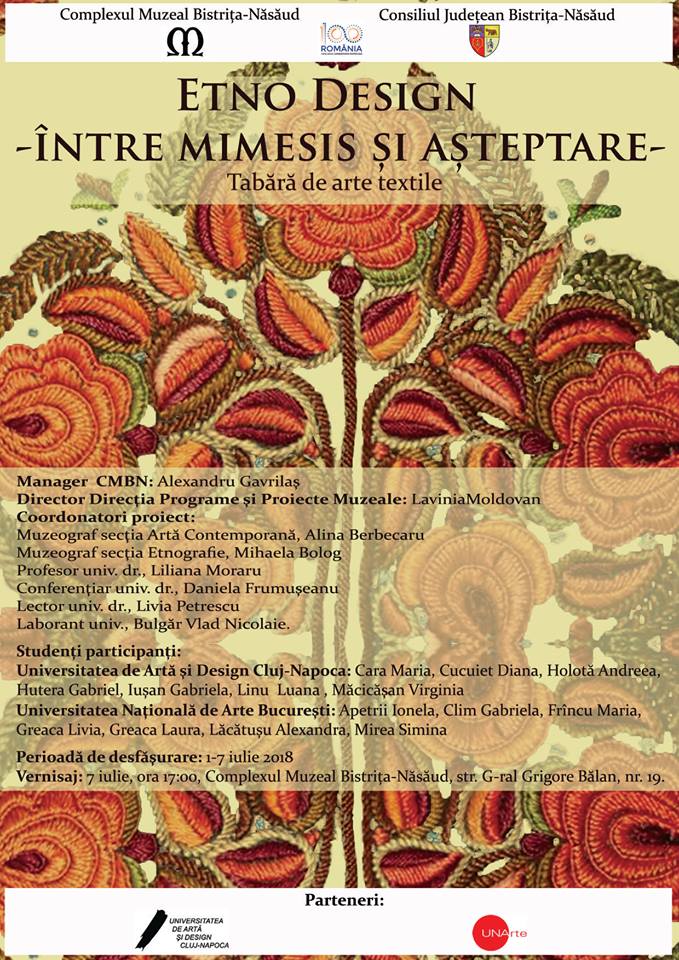 Complexul Muzeal Bistriţa-Năsăud în parteneriat cu Universitatea de Artă şi Design Cluj-Napoca şi Universitatea Naţională de Arte Bucureşti, organizează în perioada 1-7 iulie 2018 tabăra de arte textile „Etno Design – între mimesis şi aşteptare”.