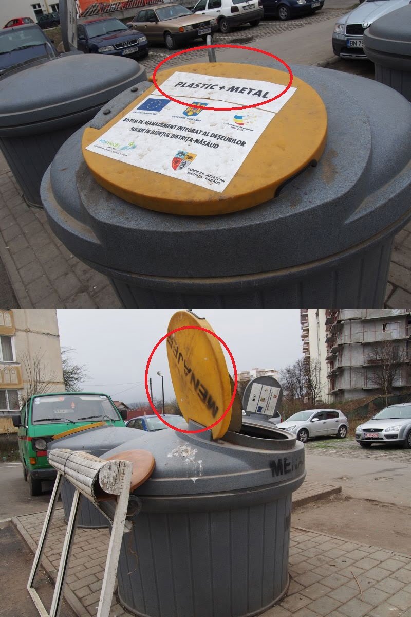 În realitate, culorile NU se respectă și majoritatea containerelor au fost transformate în containere de gunoi menajer, întocmai ca și pe vechiul sistem.