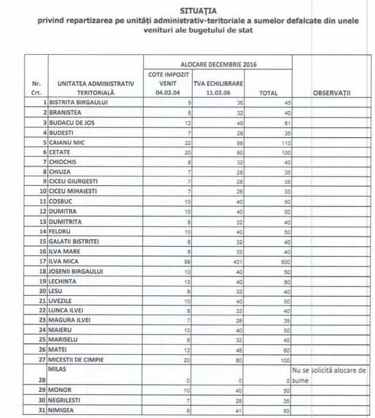 Primăria Bistrița NU a luat niciun ban, deoarece NU a depus solicitare, iar Primăria Sîngeorz-Băi NU s-a încadrat în prevederile legale. Primăria Ilva Mică a primit o sumă mare 500.000 de lei care reprezintă o parte din cofinanțare de 50% din partea Consiliului Județean a unui proiect de canalizare început în 2006 și derulat de Compania Națională de Investiții.