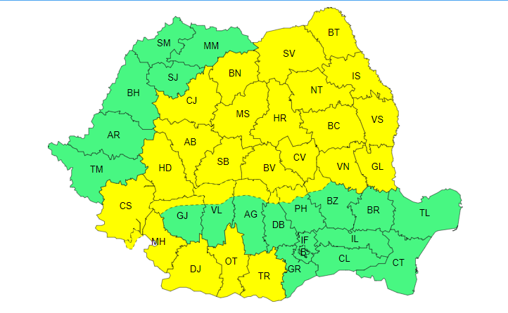 Totodată, în intervalul 10 ianuarie, ora 14:00 – 10 ianuarie, ora 23:00, în mai multe județe din țară va fi în vigoare o altă avertizare cod galben de intensificări ale vântului și viscol la munte.