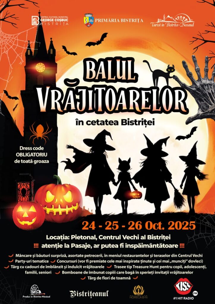 Centrul istoric al Bistriței se transformă, între 24 și 26 octombrie, într-un tărâm al magiei, poveștilor și culorilor de toamnă, la cea de-a treia ediție a Balului Vrăjitoarelor. Evenimentul aduce în fața publicului mituri și legende locale reinterpretate într-o manieră prietenoasă și plină de farmec, menite să redea viață centrului vechi al orașului.