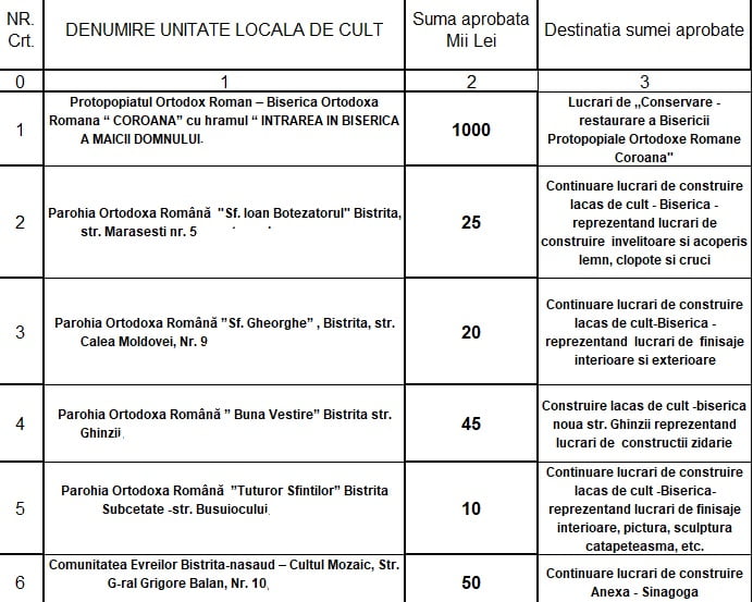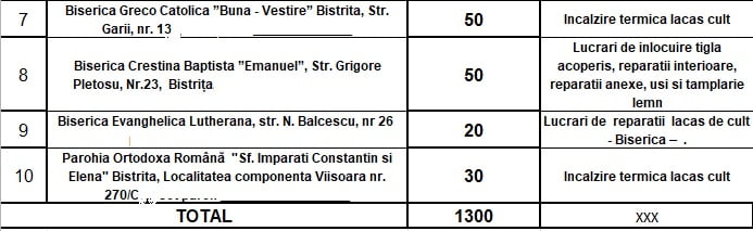 De la bugetul local al municipiului Bistrița este prevăzută suma de 1.300.000 lei, care va fi împărțită între 10 unități de cult, astfel: