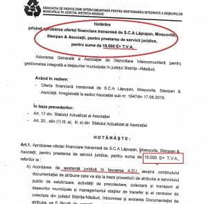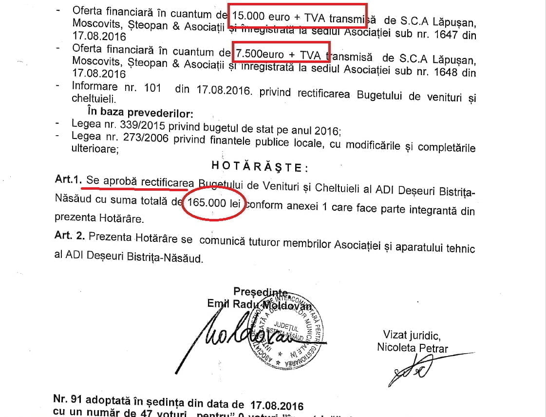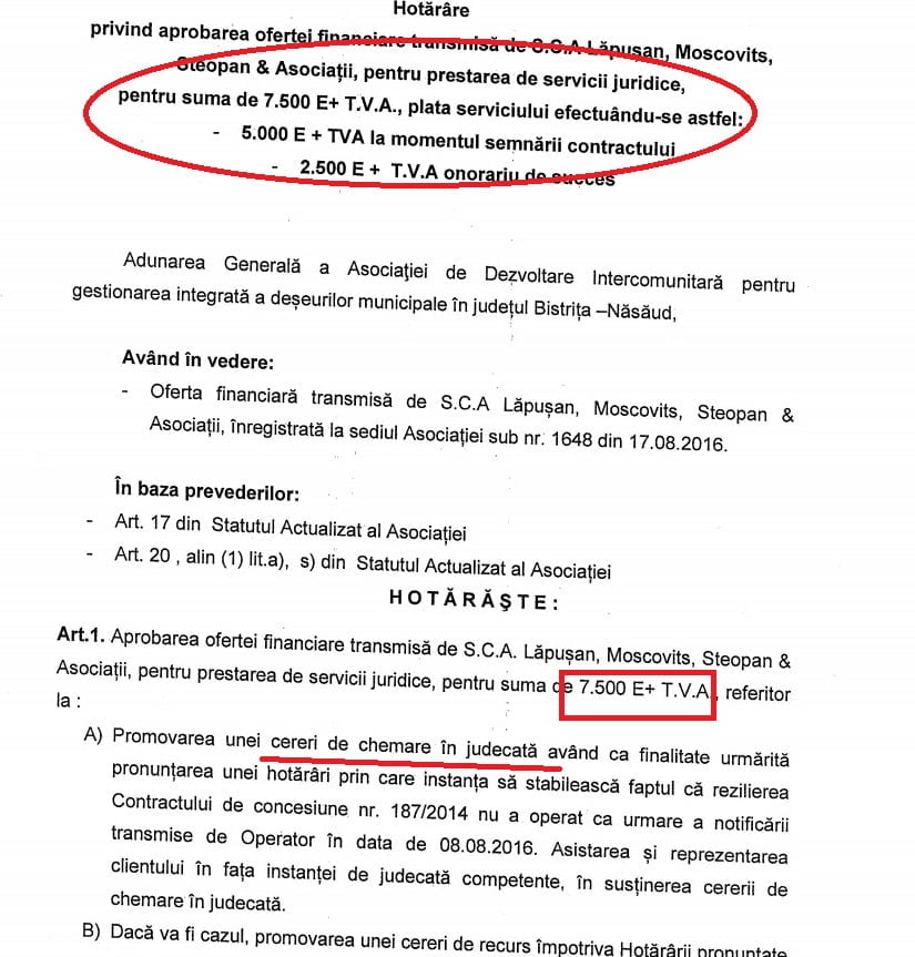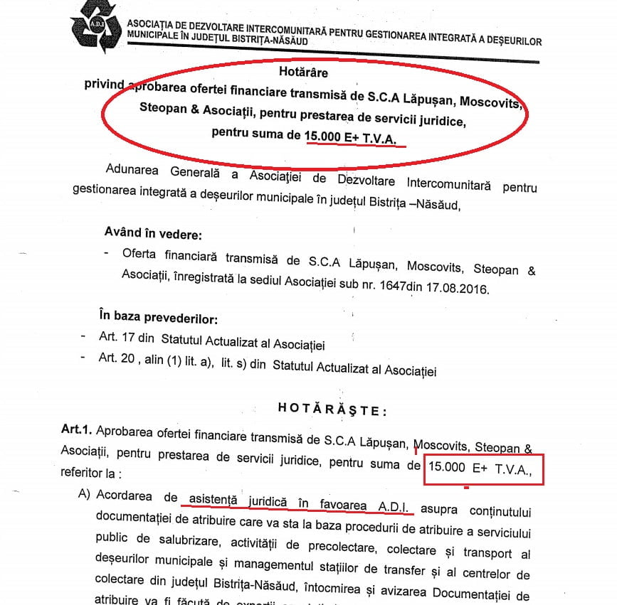 SCA Lăpușan, Moscovits, Steopan și Asociații din Cluj a transmis două oferte, iar A.D.I Deșeuri a bătut palma pentru consultanță juridică și a semnat contractul cu Casa de Avocatură din Cluj pentru AMBELE componente ale consultanței.