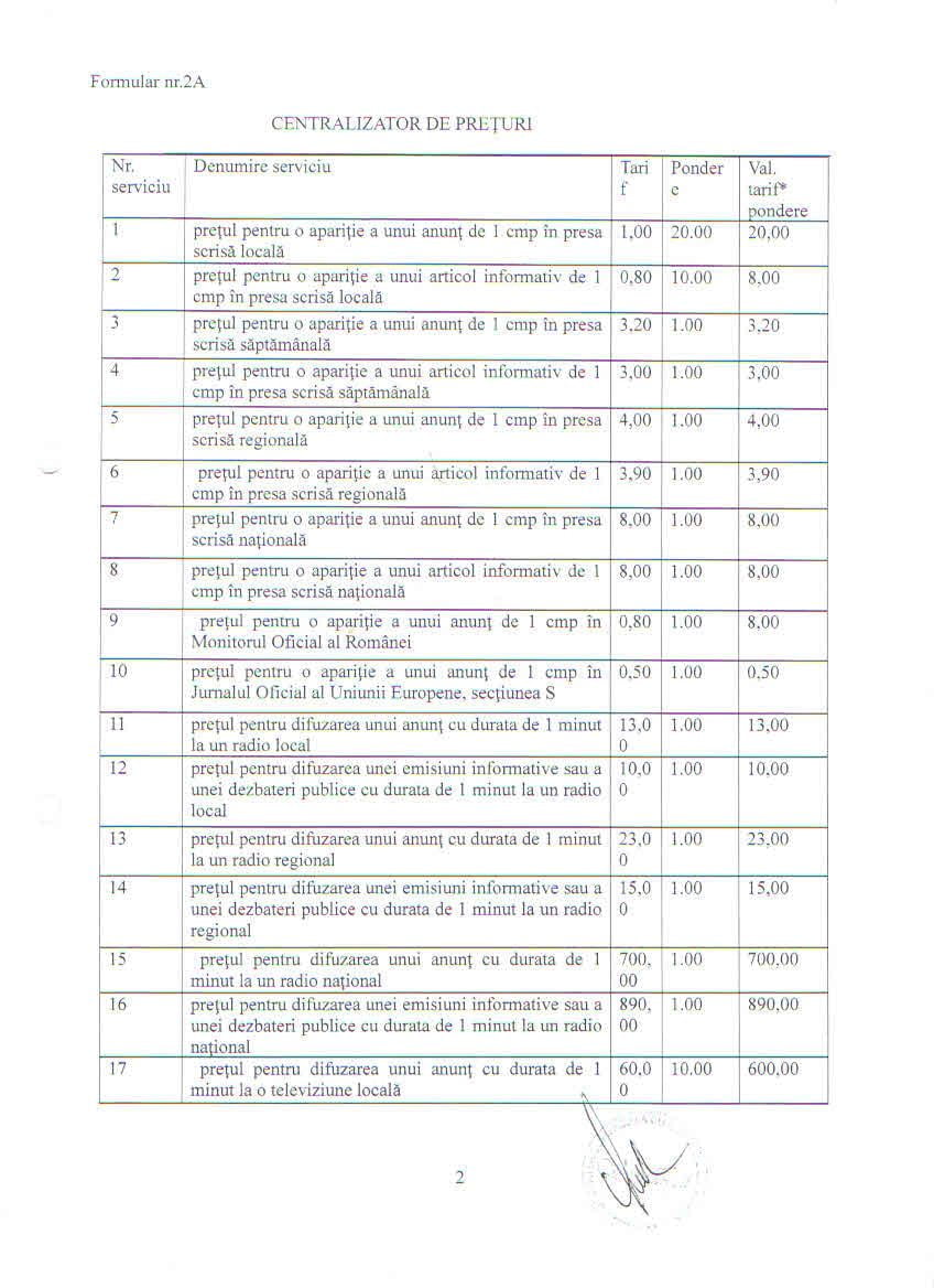 Tariful la care s-a câștigat licitația este 0.08 lei/cmp, atât policromie (adică mai multe culori) cât și 2 culori.