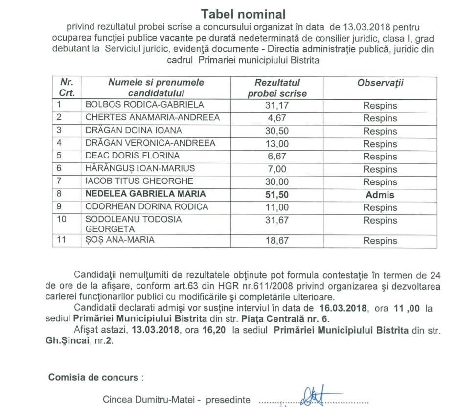Din comisie au făcut parte angajați ai Primăriei Bistrița: Dumitru Cincea, Maria Hrișcu, Alecsandra Rotaru și Iuliana Ionescu. 2 candidați au făcut contestații, dar contestațiile le-au fost respinse.