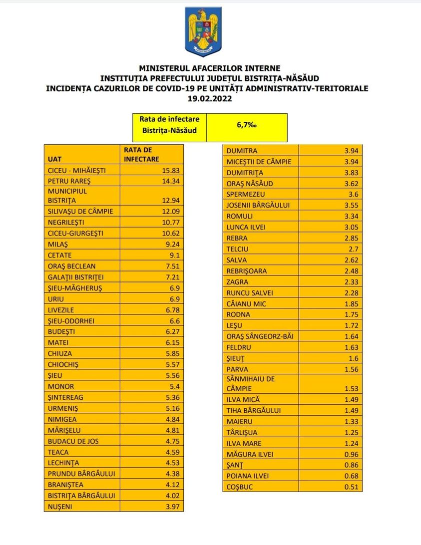 Situația cu privire la rata de infectare din unitățile administrativ-teritoriale din județul Bistrița-Năsăud: