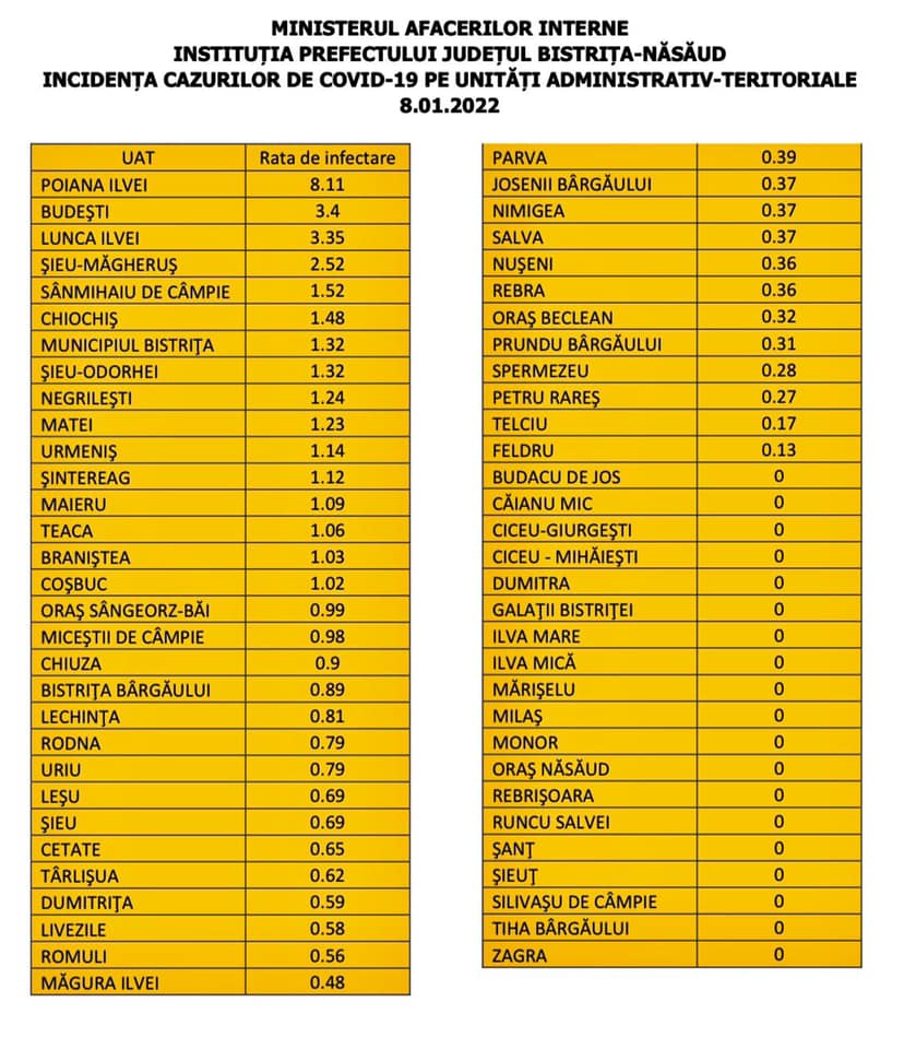 Situația cu privire la rata de infectare din unitățile administrativ-teritoriale din județul Bistrița-Năsăud: