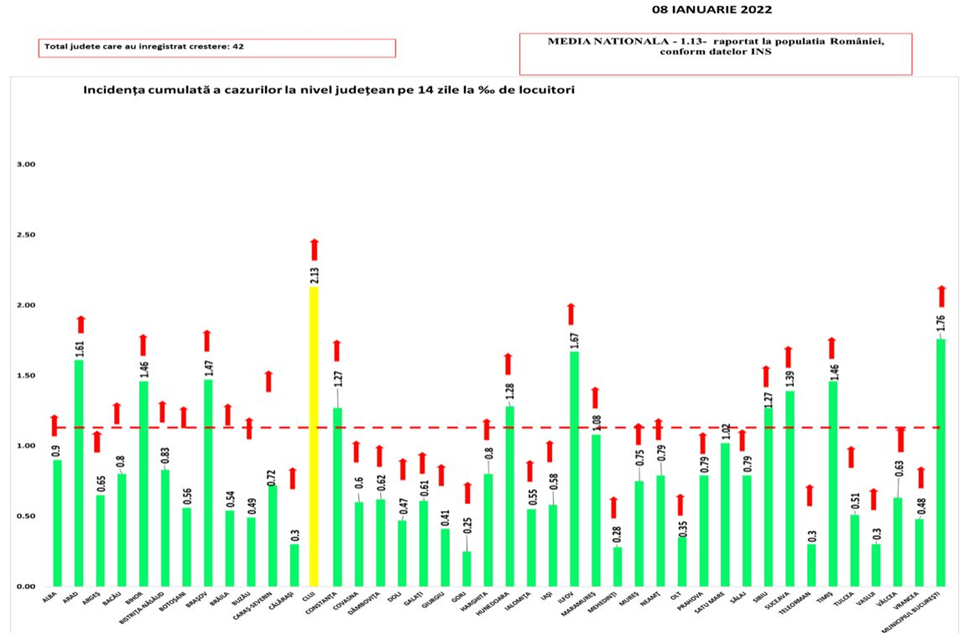 | Nr. crt. | Județ | Număr de cazuri confirmate(total) | Număr de cazuri nou confirmate | Incidența înregistrată la 14 zile |