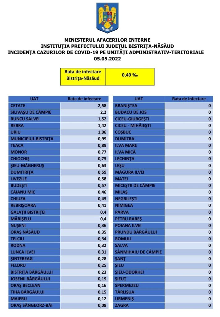 Ministerul Sănătății informează că numărul total al cazurilor de infectare cu virusul SARS-CoV-2 confirmate până astăzi în județul Bistrița-Năsăud este 29.977, cu 11 mai multe decât ieri.