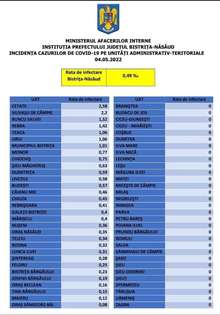 Situația cu privire la rata de infectare din fiecare oraș și comună din județ: