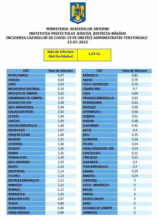 Situația cu privire la rata de infectare din fiecare oraș și comună din județ: