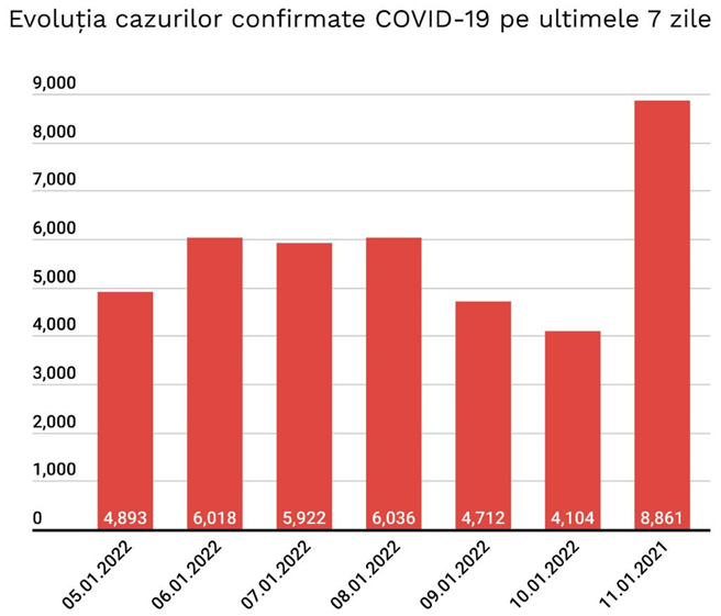 În ultimele 24 de ore au fost înregistrate 8.861 cazuri noi de persoane infectate cu SARS – CoV – 2 (COVID – 19), cu 4.757 mai mult decât în ziua anterioară. 991 dintre cazurile noi din 24 de ore sunt ale unor pacienți reinfectați, testați pozitiv la o perioadă mai mare de 180 de zile după prima infectare.