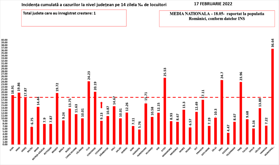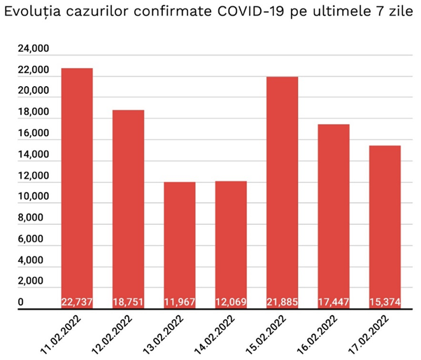 În intervalul 16.02.2022 (10:00) – 17.02.2022 (10:00) au fost raportate de către INSP 125 de decese (61 bărbați și 64 femei), dintre care 3 anterioare intervalului de referință, ale unor pacienți infectați cu noul coronavirus, internați în spitalele din Alba, Arad, Argeș, Bacău, Bihor, Bistrița-Năsăud, Botoșani, Brăila, Brașov, Călărași, Caraș-Severin, Cluj, Constanța, Dâmbovița, Dolj, Galați, Giurgiu, Gorj, Harghita, Ialomiţa, Iași, Ilfov, Maramureş, Mehedinți, Mureș, Neamț, Olt, Prahova, Satu Mare, Sibiu, Suceava, Teleorman, Vaslui, Vrancea și Municipiul București.