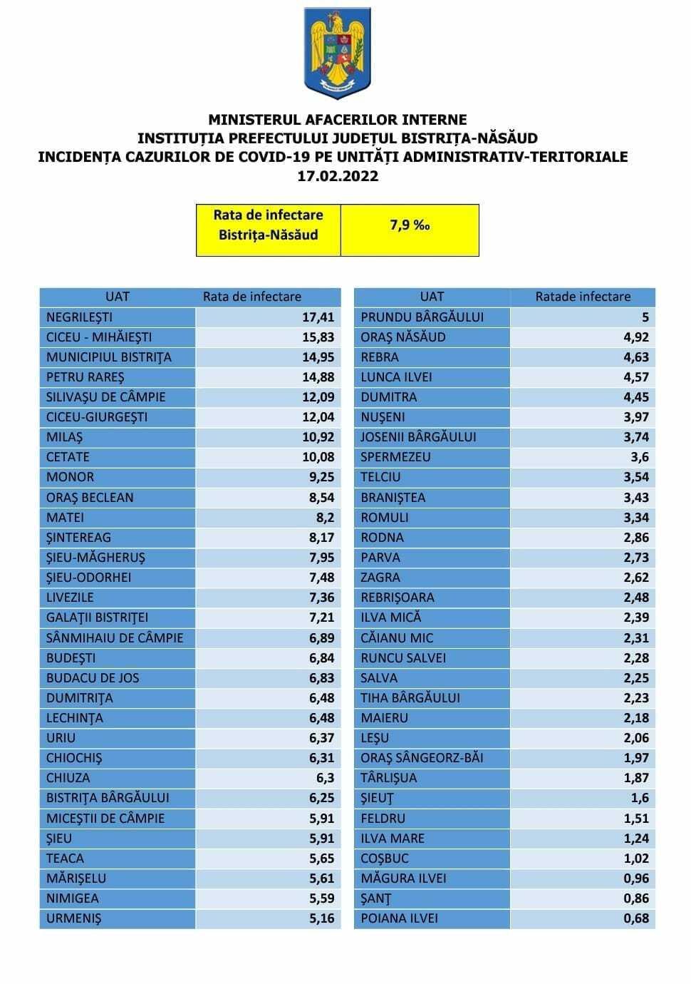 Situația cu privire la rata de infectare din unitățile administrativ-teritoriale din județul Bistrița-Năsăud: