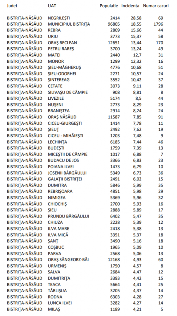Situația cu privire la rata de infectare din unitățile administrativ-teritoriale din județul Bistrița-Năsăud: