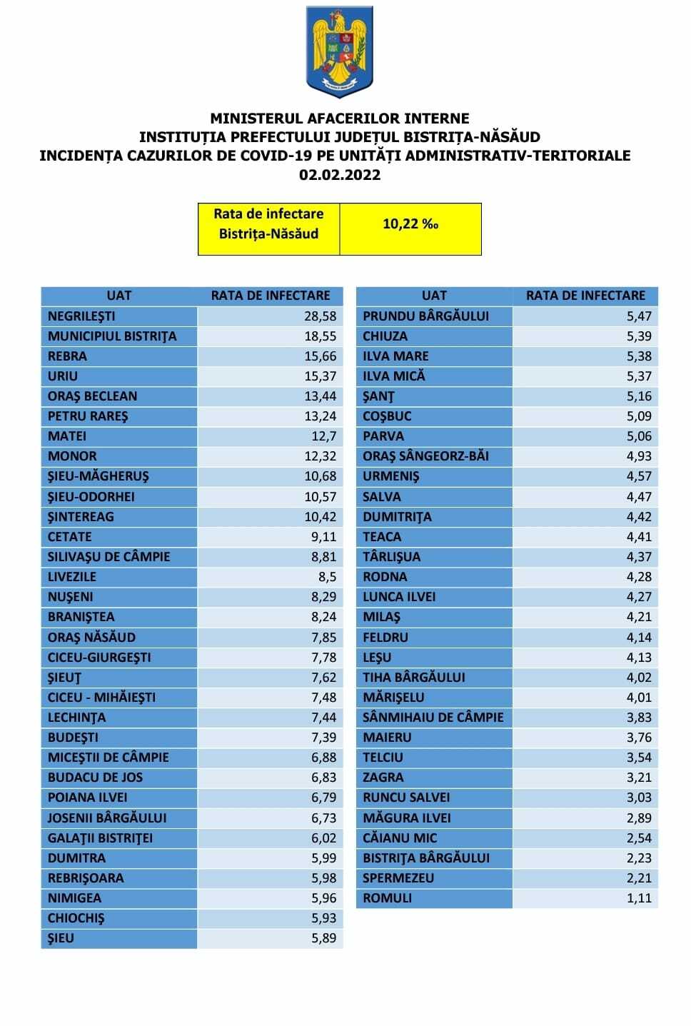 Situația cu privire la rata de infectare din unitățile administrativ-teritoriale din județul Bistrița-Năsăud: