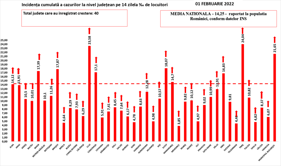 În intervalul 31.01.2022 (10:00) – 01.02.2022 (10:00) au fost raportate de către INSP 97 de decese (56 bărbați și 41 femei), dintre care 2 anterioare intervalului de referință, ale unor pacienți infectați cu noul coronavirus, internați în spitalele din Alba, Arad, Argeș, Bacău, Bihor, Bistrița-Năsăud, Botoșani, Brăila, Brașov, Buzău, Caraș-Severin, Cluj, Constanța, Dolj, Galați, Harghita, Ialomița, Iași, Ilfov, Maramureș, Mureș, Neamț, Olt, Satu Mare, Sălaj, Sibiu, Suceava, Teleorman,Timiș, Vaslui, Vrancea și Municipiul București.