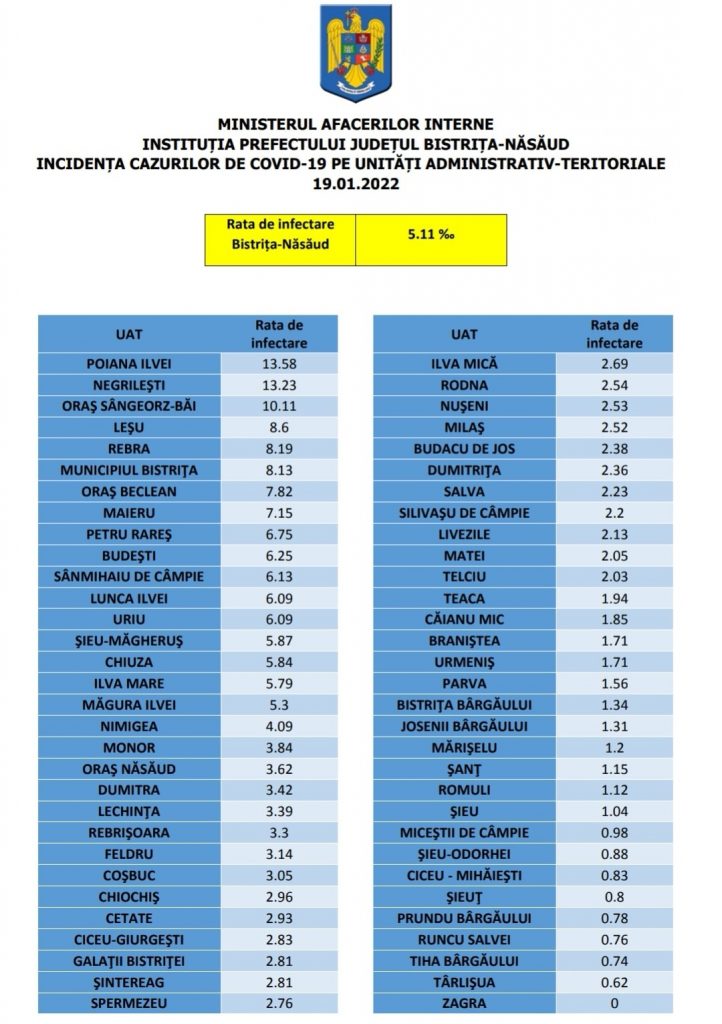 Situația cu privire la numărul de cazuri și rata de infectare din unitățile administrativ-teritoriale din județul Bistrița-Năsăud: