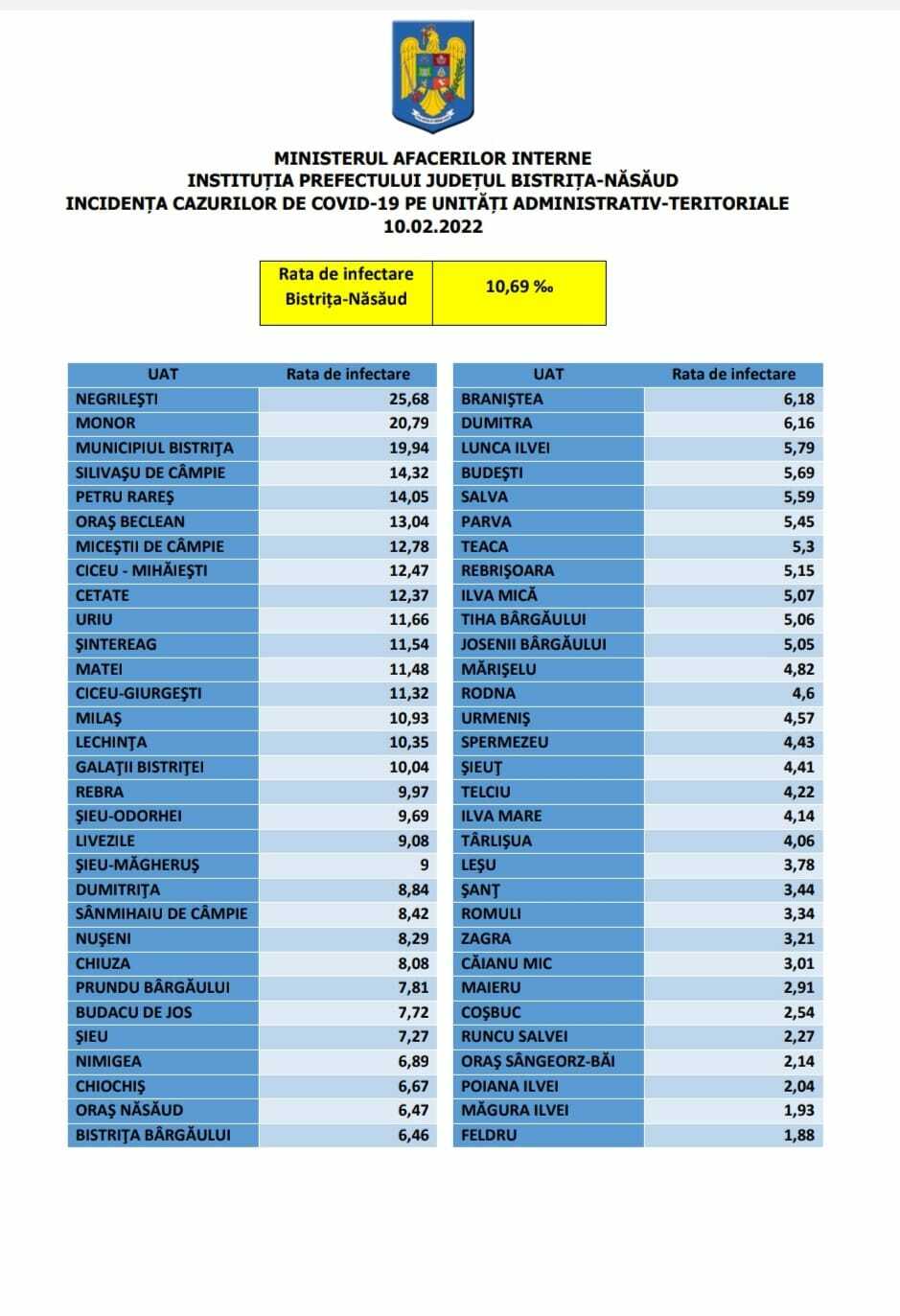 Situația cu privire la rata de infectare din unitățile administrativ-teritoriale din județul Bistrița-Năsăud: