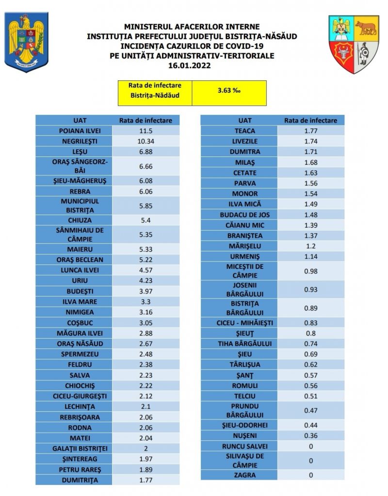 Situația cu privire la numărul de cazuri și rata de infectare din unitățile administrativ-teritoriale din județul Bistrița-Năsăud: