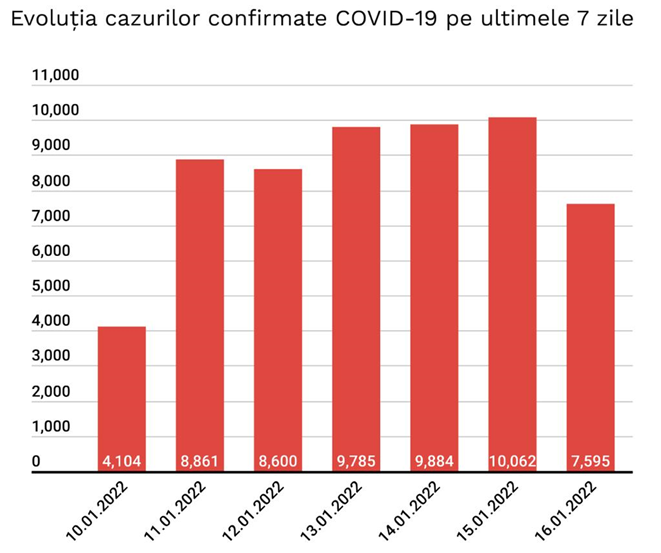 În ultimele 24 de ore au fost înregistrate 7.595 cazuri noi de persoane infectate cu SARS – CoV – 2 (COVID – 19), cu 2.467 mai puțin decât în ziua anterioară. 724 dintre cazurile noi din 24 de ore sunt ale unor pacienți reinfectați, testați pozitiv la o perioadă mai mare de 180 de zile după prima infectare.