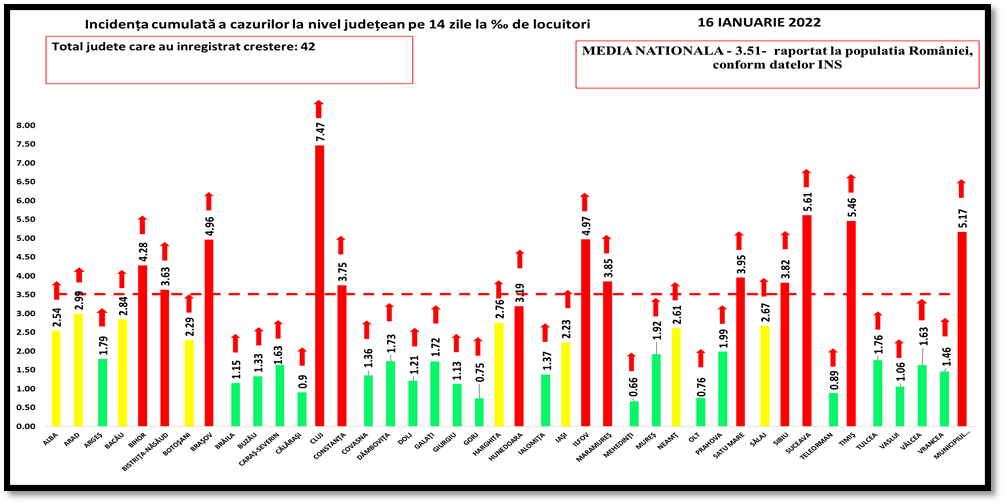 În intervalul 15.01.2022 (10:00) – 16.01.2022 (10:00) au fost raportate de către INSP 28 de decese (15 bărbați și 13 femei), ale unor pacienți infectați cu noul coronavirus, internați în spitalele din Arad, Bacău, Bistrița-Năsăud, Brașov, Caraș-Severin, Cluj, Constanța, Dâmbovița, Galați, Harghita, Maramureș, Mureș, Olt, Prahova, Suceava, Vâlcea.