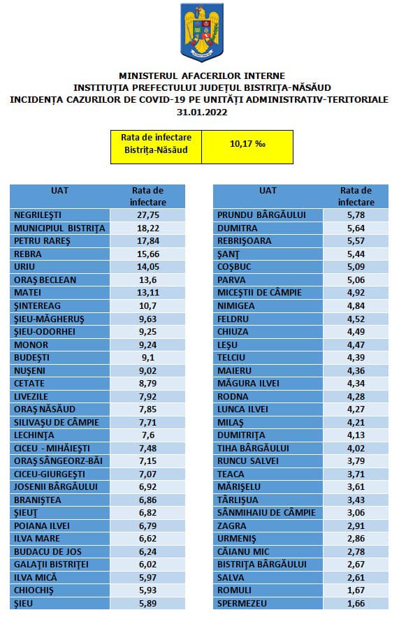 Situația cu privire la rata de infectare din unitățile administrativ-teritoriale din județul Bistrița-Năsăud: