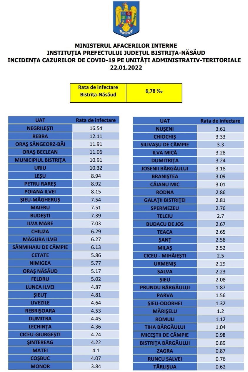 Situația cu privire la numărul de cazuri și rata de infectare din unitățile administrativ-teritoriale din județul Bistrița-Năsăud: