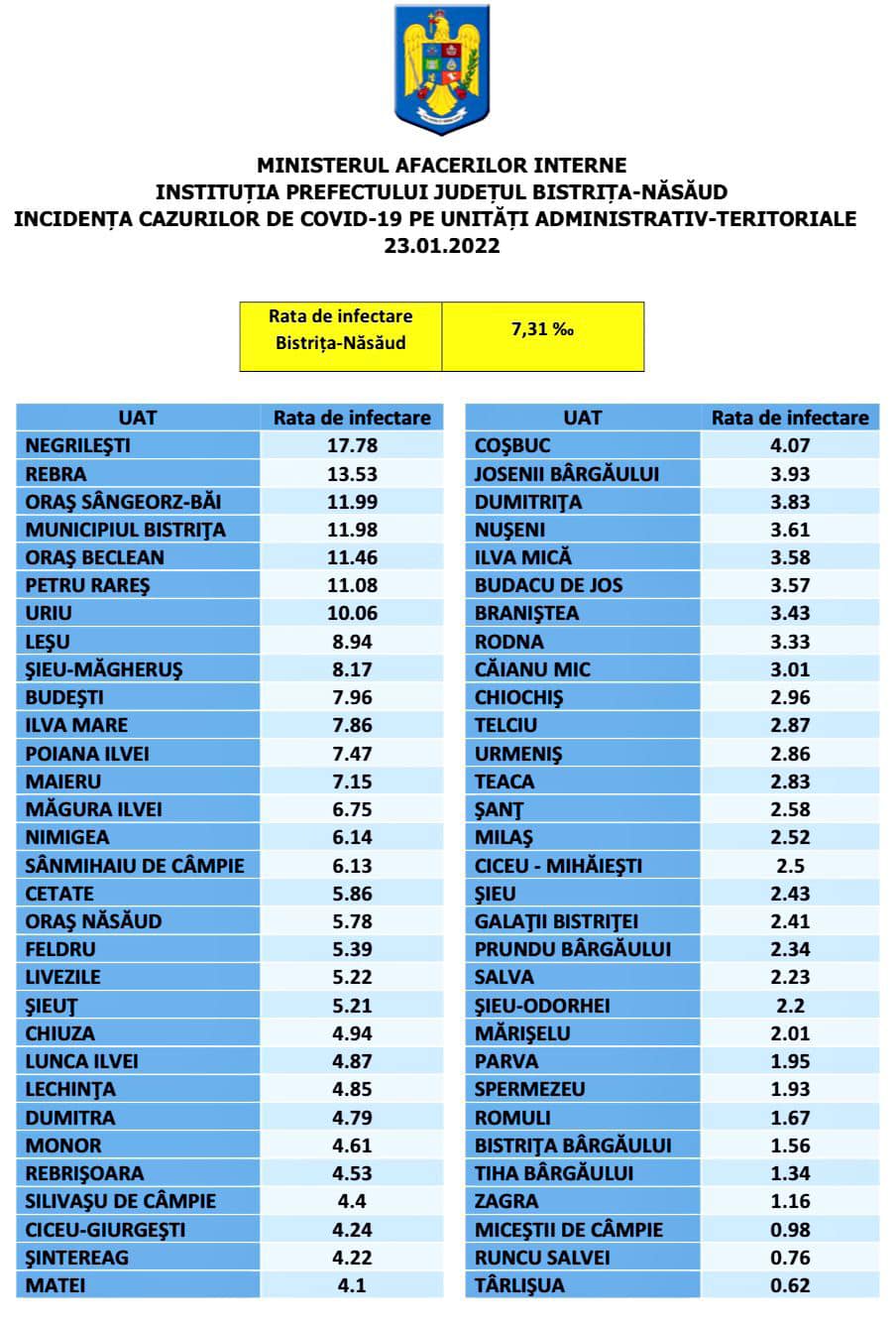 Situația cu privire la numărul de cazuri și rata de infectare din unitățile administrativ-teritoriale din județul Bistrița-Năsăud: