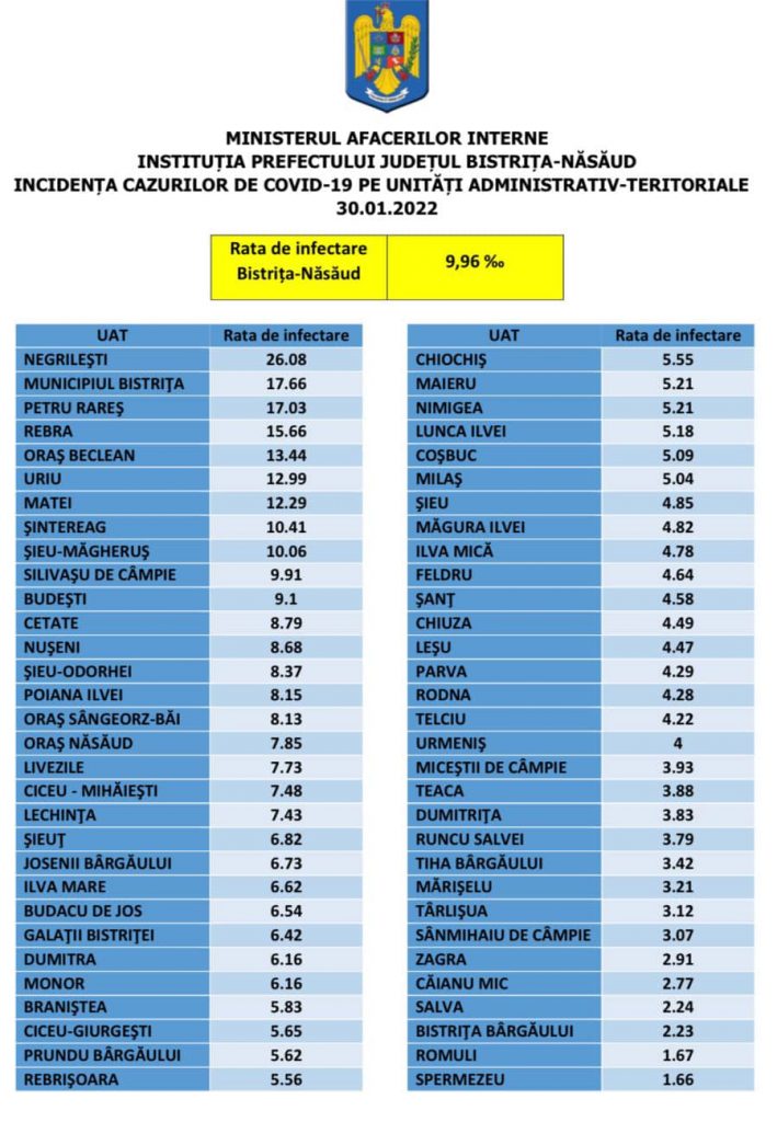 Situația cu privire la rata de infectare din unitățile administrativ-teritoriale din județul Bistrița-Năsăud: