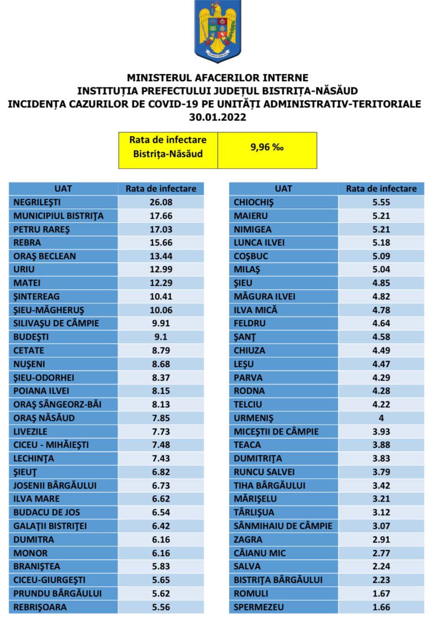 Situația cu privire la rata de infectare din unitățile administrativ-teritoriale din județul Bistrița-Năsăud: