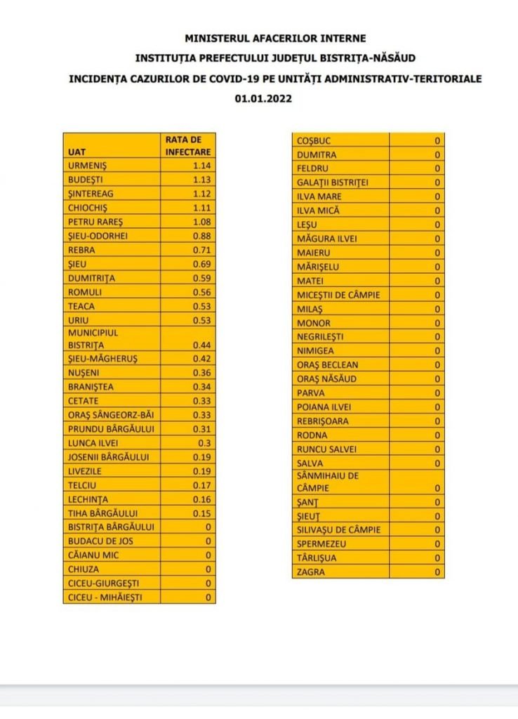 Situația cu privire la rata de infectare din unitățile administrativ-teritoriale din județul Bistrița-Năsăud: