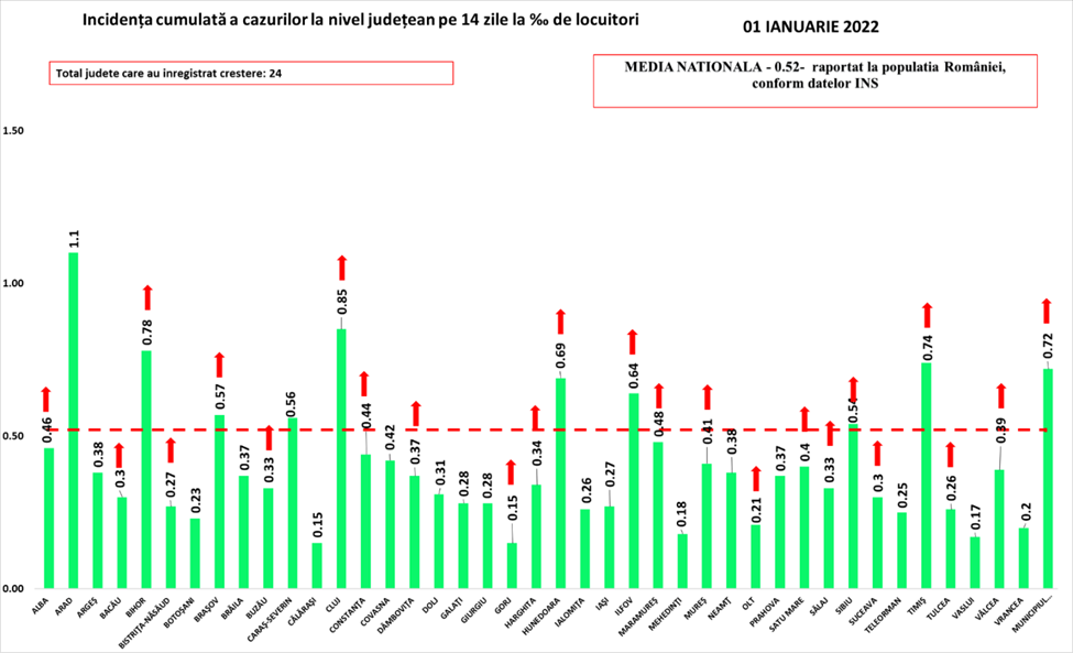 În intervalul 31.12.2021 (10:00) – 01.01.2022 (10:00) au fost raportate de către INSP 27 de decese (11 bărbați și 16 femei), dintre care unul anterior intervalului de referință, ale unor pacienți infectați cu noul coronavirus, internați în spitalele din Alba, Argeș, Arad, Bistrița-Năsăud, Buzău, Constanța, Gorj, Harghita, Ialomița, Maramureș, Mureș, Neamț, Satu Mare și Municipiul București.
