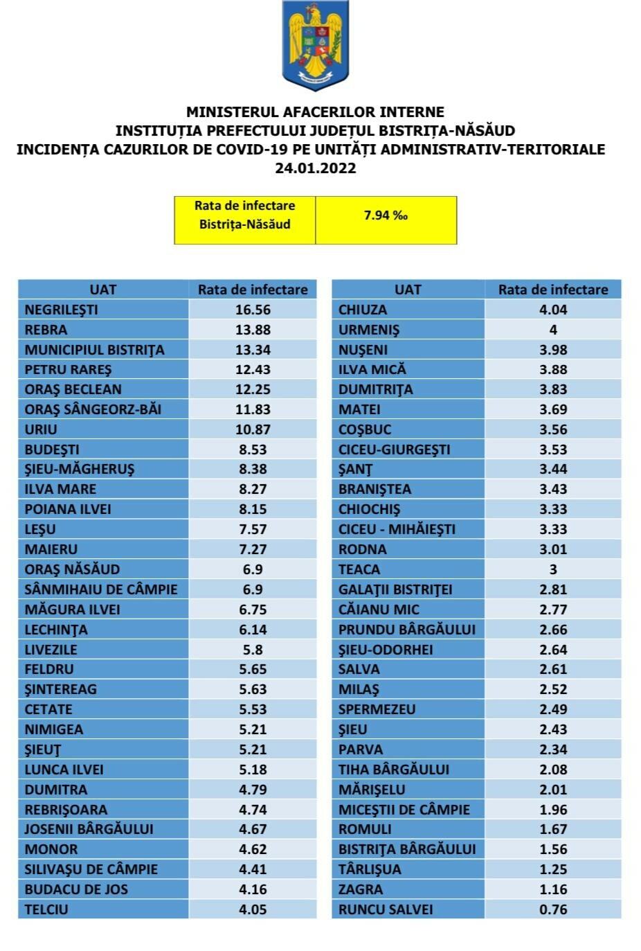 Situația cu privire la numărul de cazuri și rata de infectare din unitățile administrativ-teritoriale din județul Bistrița-Năsăud: