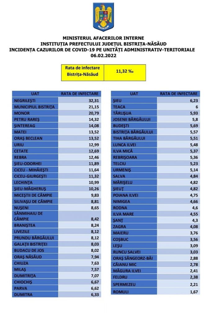 Situația cu privire la rata de infectare din unitățile administrativ-teritoriale din județul Bistrița-Năsăud: