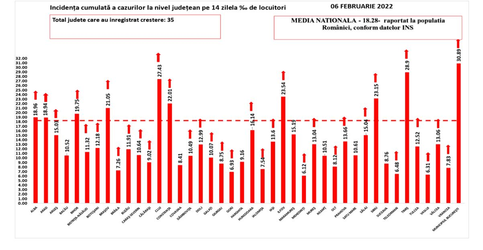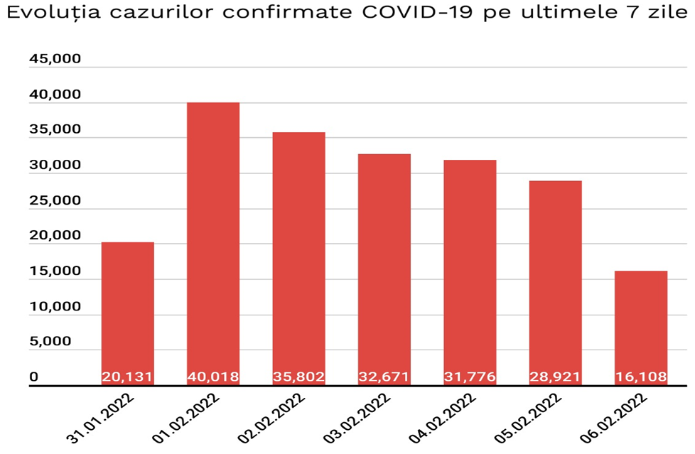 În intervalul 05.02.2022 (10:00) – 06.02.2022 (10:00) au fost raportate de către INSP 82 de decese (45 bărbați și 37 femei), dintre care şapte anterior intervalului de referință, ale unor pacienți infectați cu noul coronavirus, internați în spitalele din Alba, Argeş, Arad, Bacău, Bihor, Bistrița-Năsăud, Brăila, Botoşani, Brașov, Buzău, Cluj, Călărași, Caraș-SeverinBâmboviţa, Dolj, Gorj, Harghita, Ilfov, Maramureș, Neamţ, Prahova, Sibiu, Sălaj, Satu Mare, Suceava, Timiș, Vălcea, Vaslui și Municipiul București.