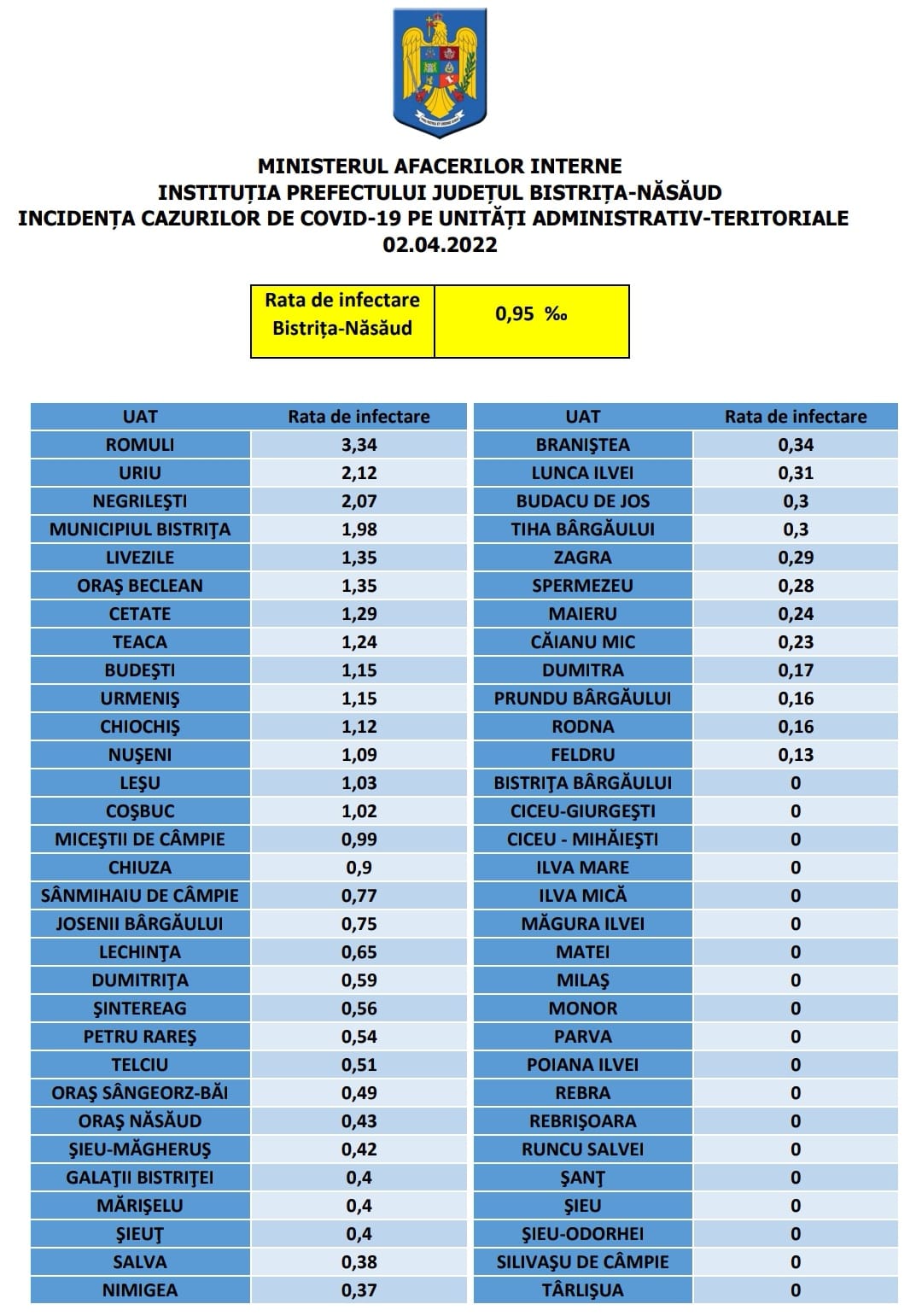 Ministerul Sănătății informează că numărul total al cazurilor de infectare cu virusul SARS-CoV-2 confirmate până astăzi în județul Bistrița-Năsăud este 29.615, cu 33 mai multe decât ieri.