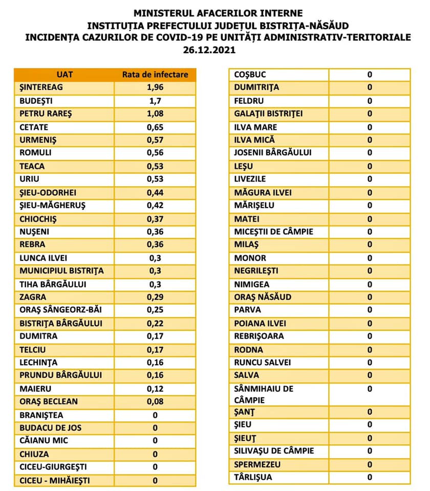Situația cu privire la rata de infectare din unitățile administrativ-teritoriale din județul Bistrița-Năsăud: